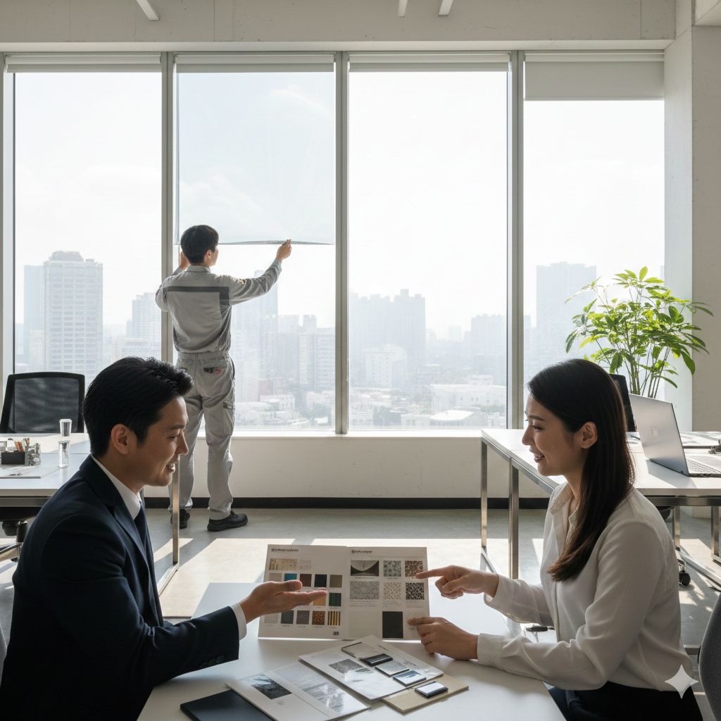 どのようなご相談でも構いません。まずはプロの目で、貴社のオフィス環境を診断させてください。カタログや実際のフィルムサンプルを持参し、お客様の課題にベストマッチする一枚をご提案いたします。